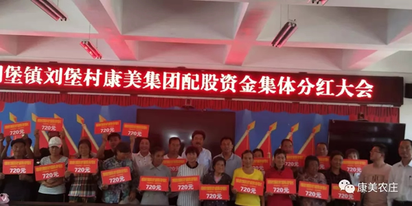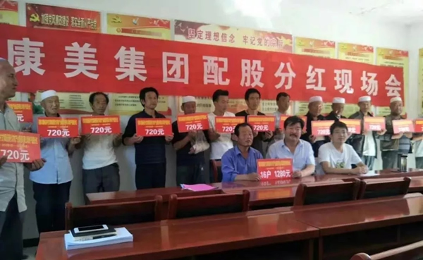 康美集团下属子公司张家川康伟良种肉牛繁育场及临洮县康和良种肉牛繁育公司与贫困户相继签订了配股协议,贫困户入股给企业,企业按比例每年分红,以提高贫困户收入,目前,公司已带动产业扶贫资金入股贫困户6716户,每年按期足额给贫困户进行分红,截止日前累计分红1445.42万元。